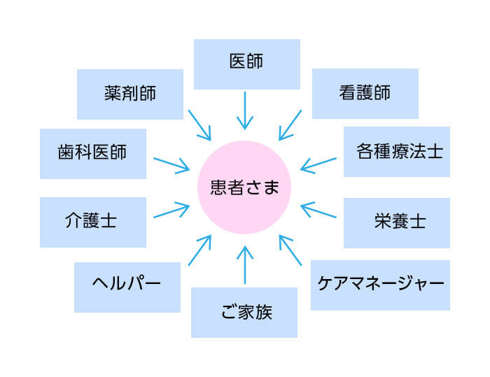 医師、歯科医師、看護師、薬剤師、ケアマネージャー、理学療法士、栄養士など様々な職種のスタッフが在宅医療にかかわります。治療はもちろんの事、生活状況や栄養状況、介護の状態を把握して患者さまやそのご家族の精神面を支えていきます。